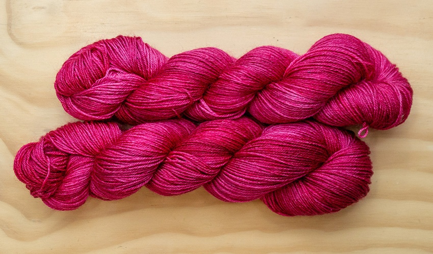 When I think about cozy activities around autumn and Thanksgiving, I think about apple picking, the warmth of apple cider or mulled wine, and cozy vibrant shades of red that freckle the sky. For these skeins of yarn, I wanted to show off the beautiful soft sheen of MAGNOLIA because it really shines with a multifaceted, custom shade of red. Combining three colors to create one custom shade allows for a depth of color that shows off the nuances created in this fall inspired yarn.