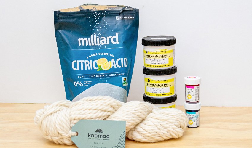 A bond forms because protein fibres are made up of twenty amino acids. The amino acids primarily form ionic bonds with the dye pigment. Ionic bonds are bonds between two oppositely charged molecules. This is the same effect as putting two North and South magnets together. The magnets zoom together and stick. That is how the dye molecules bond to the fibre. Once you have created the right environment, the dye bonds with the fibre, making a vibrant, hand-dyed skein of yarn. All Knomad yarn blends contain at least 50% protein fibres so the methods discussed below can be used on your favorite skein of Knomad yarn!