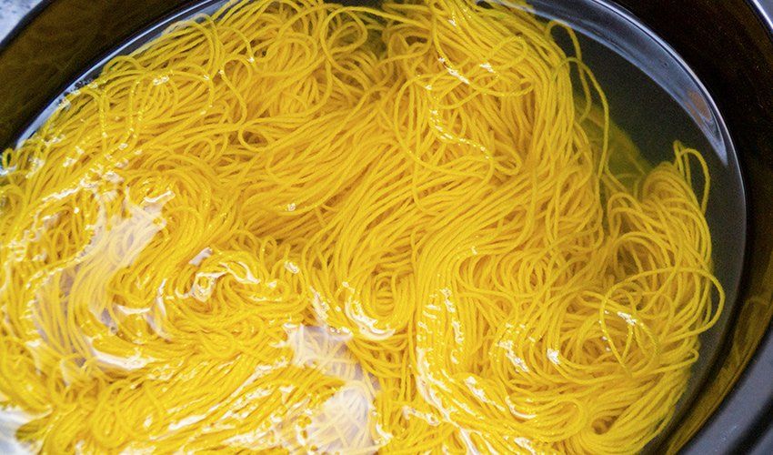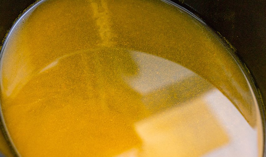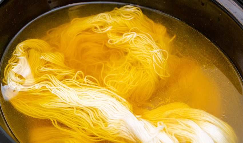 When the turmeric is fully dissolved, fill the dye vessel with enough cool water to cover the yarn.