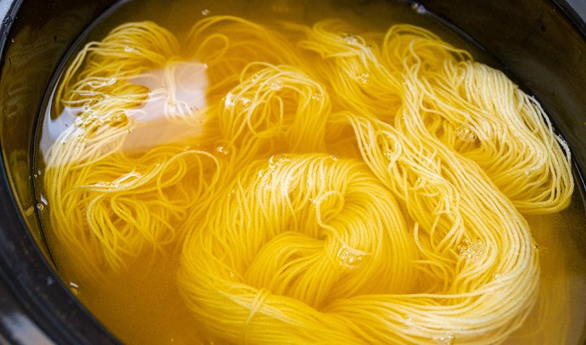 Once your yarn is a bit darker than desired, remove it from the heat to allow it to cool. Yarn will lighten as it dries.