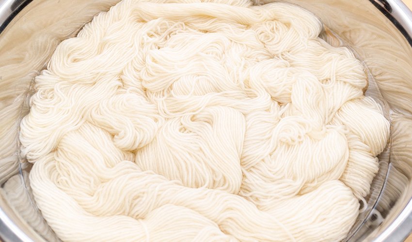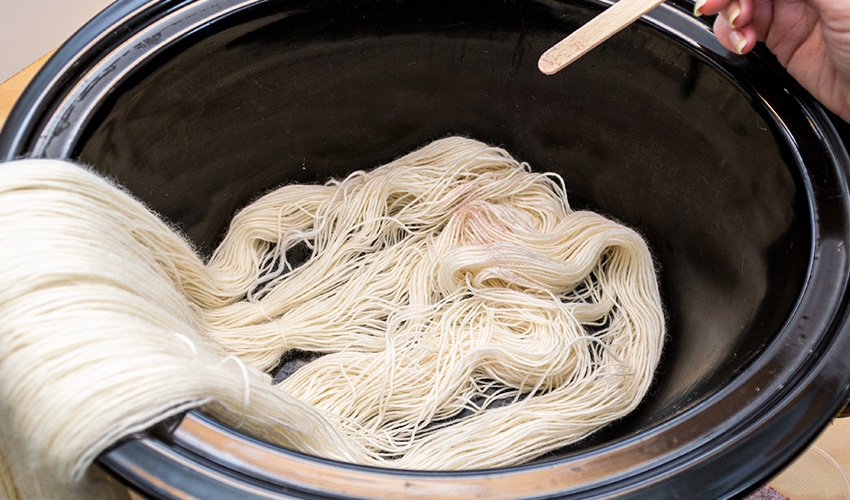 Turn off the heat after 30 minutes and allow the yarn to cool fully. Once the yarn is fully cooled, rinse it under cool water until the water runs clear. Squeeze out all of the excess water and hang the yarn up to dry.