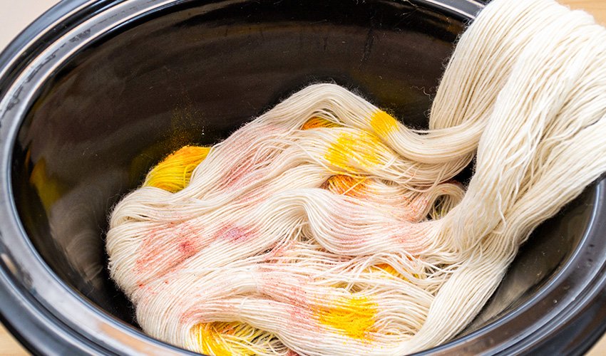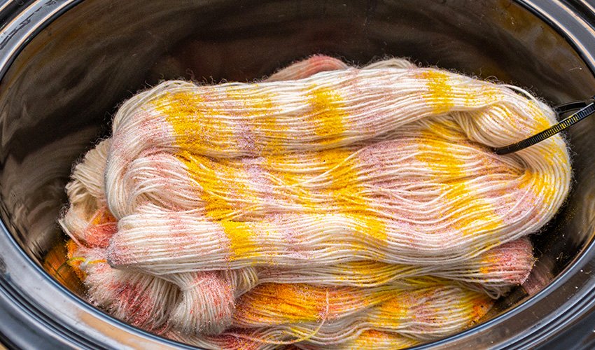 Continue adding more yarn and dye to the slow cooker one section at a time until you have sprinkled dye onto both skeins. Turn on the slow cooker to high heat up the yarn for 30 minutes. If desired, spray some sections with water to blend the colors in some areas and leave other areas with more defined speckles. I sprayed some of the yellow sections for a softer light background color and left the darker colors alone.