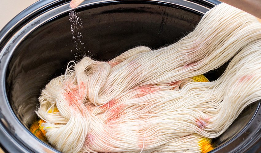 Lay the bottom of your first undyed skein of yarn flat in the bottom of the slow cooker. The rest of the skein will remain outside of the slow cooker for this part. Using a spoon or a popsicle stick, gently scoop out and shake the powdered dye and citric acid mix across the yarn. Less dye will result in more muted colors and more defined speckles. More dye will blend softly for a more painterly, watercolor effect.