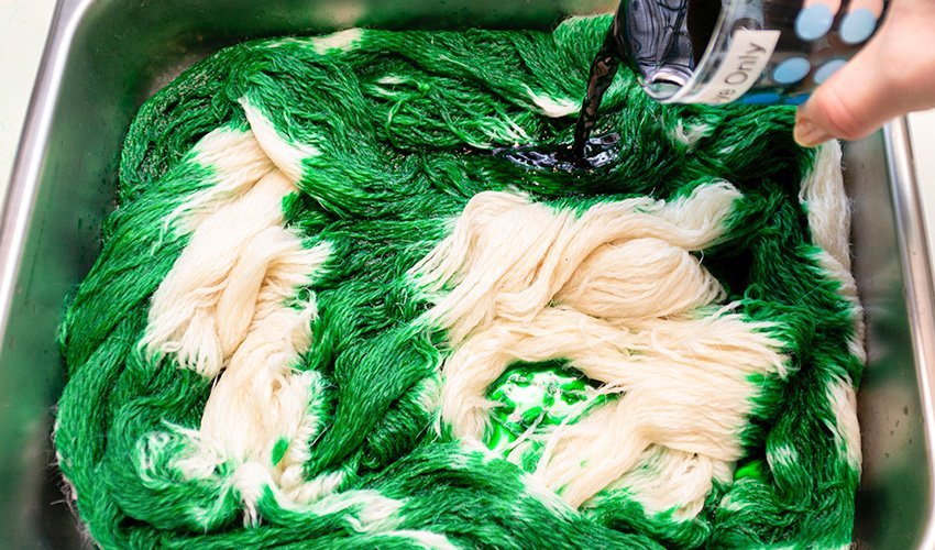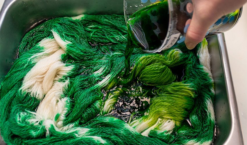 Add the EMERALD GREEN dye first by pouring it onto the yarn in the chafing dish. Leave about 50% of the yarn bare. Use tongs to move the yarn around to achieve your desired level of dye saturation.