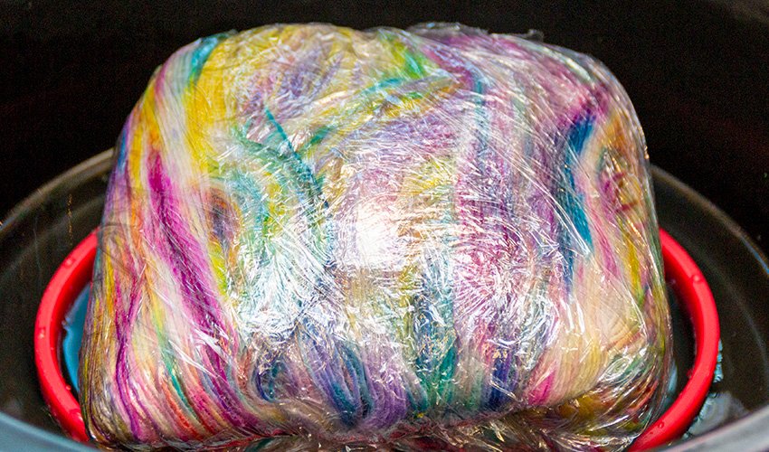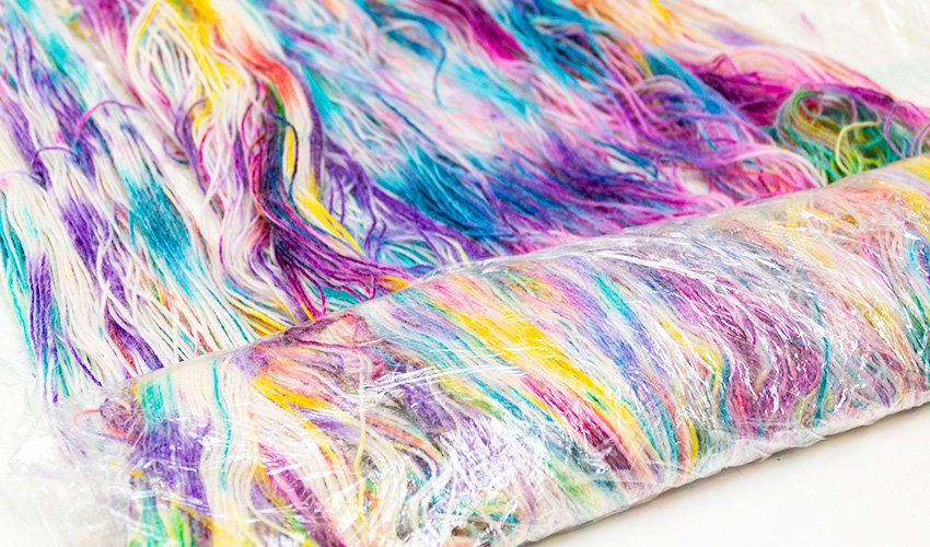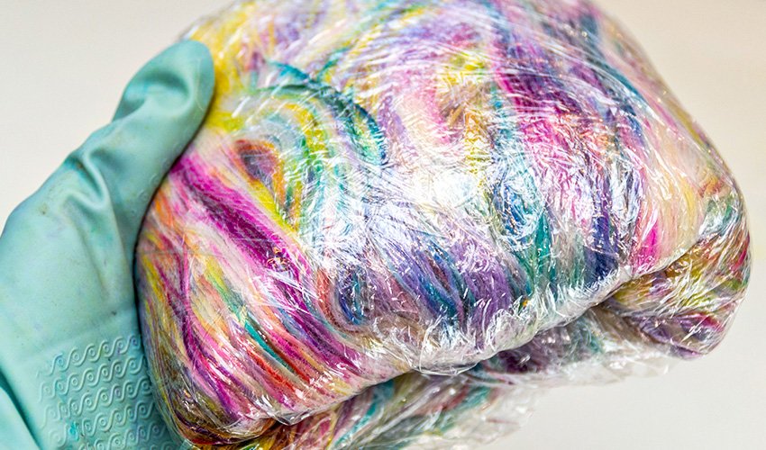 Roll the dyed yarn up in the plastic wrap that it is sitting on top of starting from one end and rolling straight to the other end. If needed, shift the yarn to the center a little so there is a little bit of plastic wrap on each side so you can tuck the plastic wrap all the way around the yarn. The finished bundle should have all of the yarn fully wrapped in plastic.