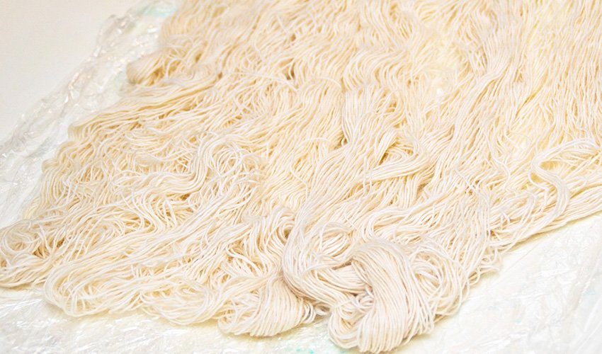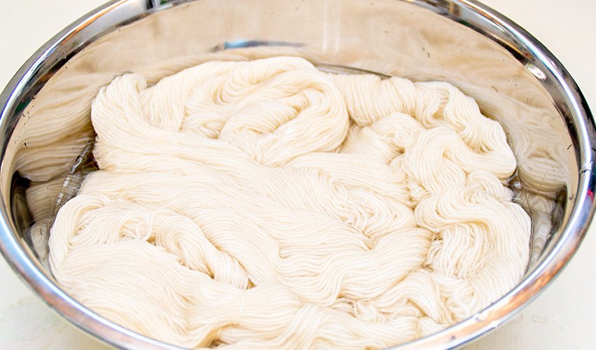 Add a dash of citric acid to the large bowl and fill the bowl two thirds of the way full with cool water. Stir to dissolve the citric acid. Add your two skeins of EGRET to the bowl and allow to presoak until the yarn is fully saturated. This will take about an hour. Once the yarn has been fully saturated, squeeze out all the excess water really thoroughly. The yarn should be damp to the touch but not dripping.