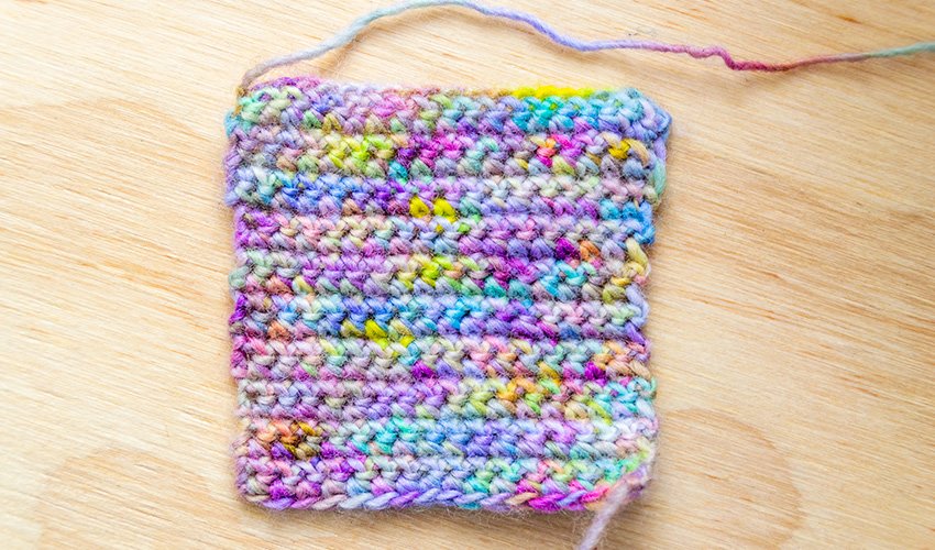Once your yarn has set and fully cooled, rinse it thoroughly under cool running water until the water runs clear. Squeeze out the excess water and hang it up to dry. Your freshly hand-dyed yarn is ready to use! I was so excited I went ahead and crocheted up a test swatch. This is 20 stitches of single crochet using a 3.5mm hook.
