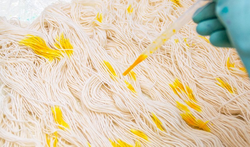 Starting with Brilliant Yellow, squeeze the pipette to fill it with the dye solution and use it to spread the dye across the skeins of EGRET evenly in small sections. Aim for one to two-inch sections of dyed yarn. Move the skeins around to make sure the underside of the yarn is dyed as well.