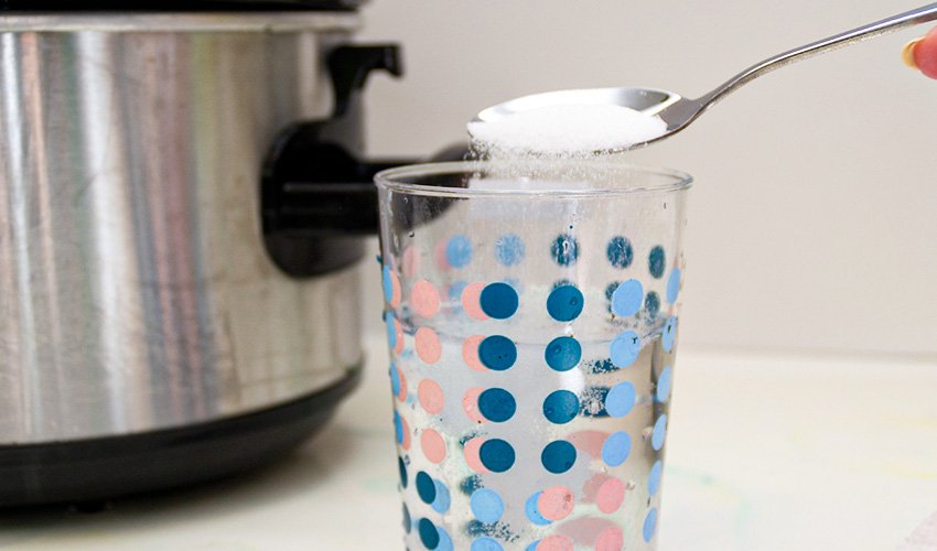 While the yarn is heating up in the dye bath, prepare the citric acid. Fill a cup with about 6 ounces of water and dissolve a spoonful of citric acid into the cup.