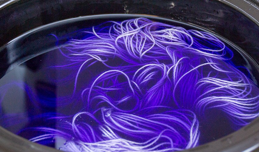 Purple is a composite dye – meaning it has multiple colors to create one new color – and adding the acid to the dye bath at the end when the dye bath is already hot helps the different pigments absorb evenly for a uniform color.