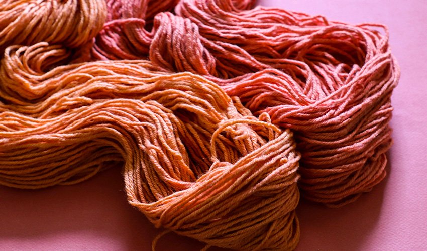 If you notice at this step that your yarn has taken more orange than red, you can modify the dye bath with calcium carbonate, also known as chalk. If you don’t have this modifier on hand, check the antacid aisle of your local pharmacy for calcium carbonate antacid tablets. Usually one or two of these crushed up is enough to modify. If you are using calcium carbonate powder from a dye supply source, you’ll need to add about 1 tsp (5 g) per 100 g of fibre, so 10 g or 2 tsp for this experiment. Mix the powder with hot water to dissolve it and add it to the dye bath, or, create a separate calcium bath and simply soak your yarns in the dye bath to transition their color to a cooler red, less orange base.