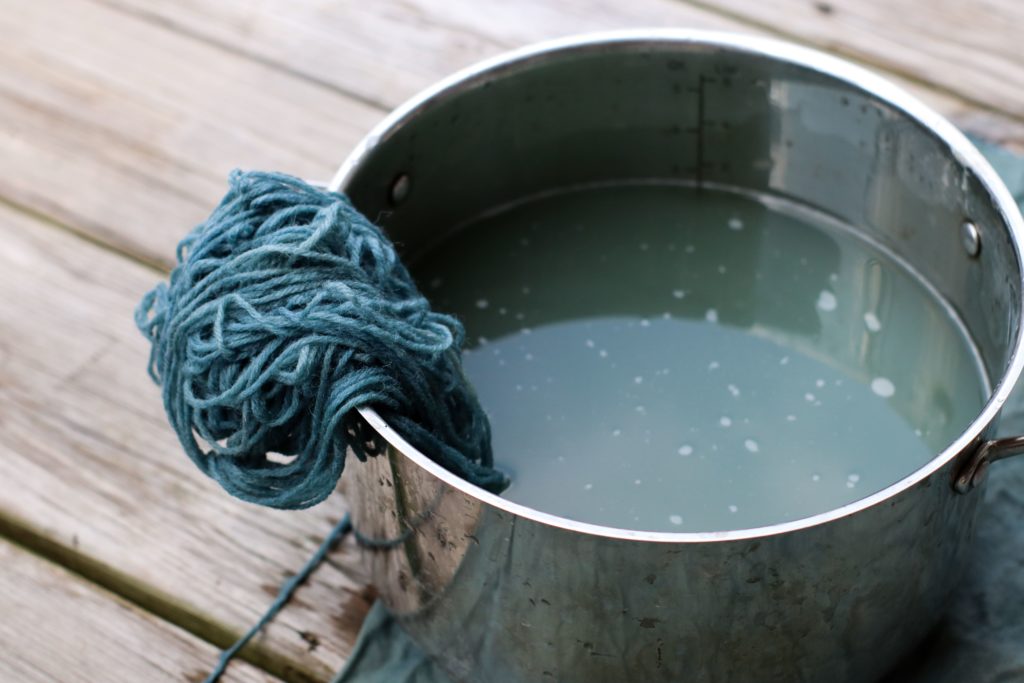 Knomad pre-scours and washes their yarns before shipping them to us, but indigo can be a little pickier than some other natural dyes. For more even coverage than what you’ll see on some samples here (dyed without additional scouring), you can do an additional round of scouring. In a separate pot, heat up water until it is just too hot for you to touch, then add a bit of wool soap, swishing to distribute it through the water. Add your yarn and keep it hot for 30 minutes, then turn off the heat. Don’t stir excessively, as it could felt your wool, but move the yarn around and then let it cool to the touch (you’ll have plenty of time to do this white your vat is cooling). When it’s cool enough to touch, strain out the water and add it to a clean hot water bath to rinse. It’s okay to keep the fibre warm–it will be warm while you’re dyeing, so we want to try and maintain as consistent a temperature as possible.