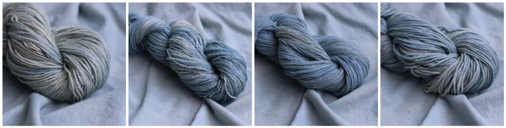 Do a minimum of 3 dips per skein. From that point, it’s up to you how many dips you’d like to do! I did my dips in groups of 3, dipping the lightest skeins only 3 times, and the darkest (medium blue) skeins about 9 times. With the concentration of my bath, I could also choose to dip only three skeins, and could probably get more drastic changes between each, or two for even higher contrast.