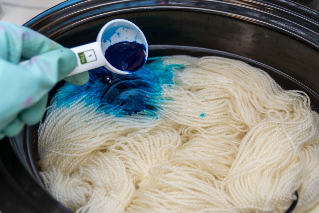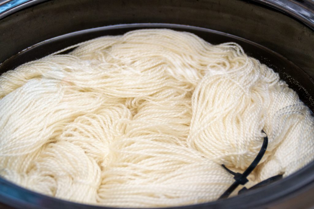 One interesting fact about RIT dye is that it is a composite dye. Composite dyes have the ability to bind to a number of fibres, depending on the additives in the dye bath. Since we are working with yarn that is primarily wool, which is a protein fibre, we want to add acid to this dye bath to ensure the protein fibres bond with the pigment. Read more about this process in the blog post “The Science of Yarn Dyeing.”