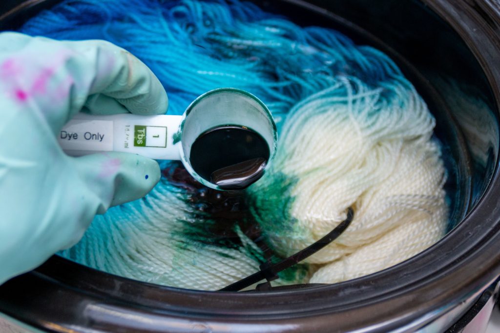 Put the lid on and turn on the heat and bring the water with the yarn in it to just below simmering. The lid should be full of steam but there should not be consistent bubbling. Put on gloves. Once the yarn and water are hot, add one tablespoon of Aquamarine RIT dye to one third of the dye bath. Use chopsticks or tongs to work the dye into that one section by lifting up small sections of yarn.