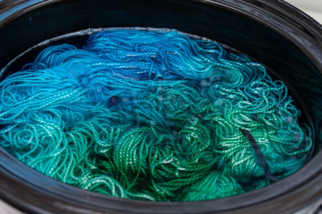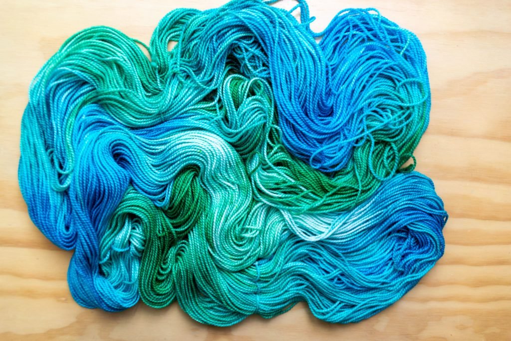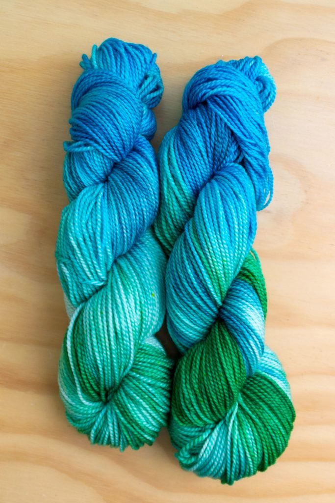 Turn off the heat and remove the lid and allow your yarn to cool fully. Then rinse the yarn, and hang it to dry! Now your freshly dyed yarn is ready to use! The twisty texture of DUO absorbs the blues and greens in such a beautiful, textured, way that it is practically begging to be on your needles for your next project!