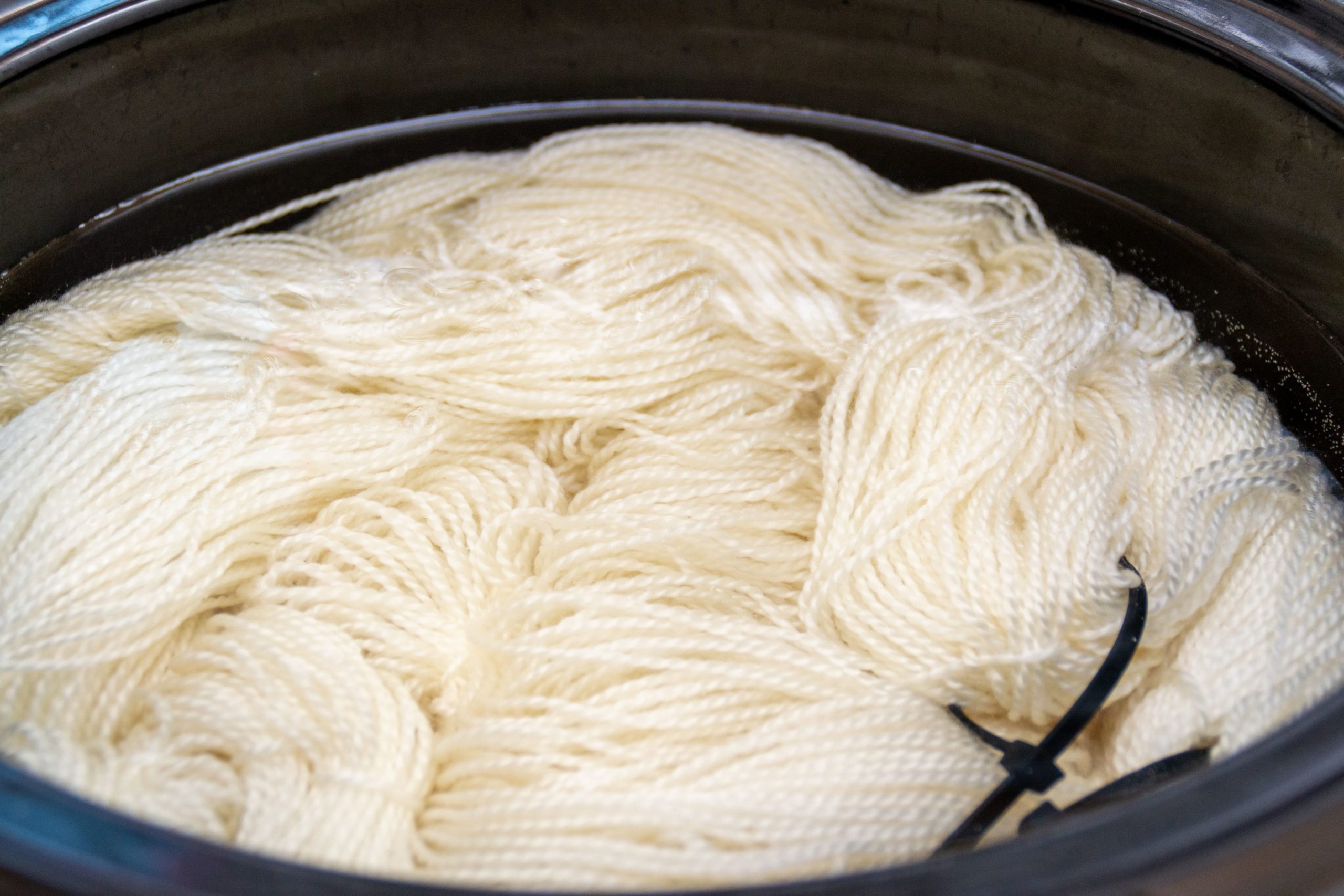Loop a zip tie around each skein if you are using them. Zip ties help keep the yarn from tangling in the dye bath and provide an easy loop to grab onto. Fill the slow cooker or stock pot a little over halfway with cool water. Add a dash of citric acid or white vinegar and stir to dissolve. Add in the two skeins of DUO and press them under the water to submerge. Leave the yarn to soak until the water is fully absorbed. This takes about 30 minutes to an hour.