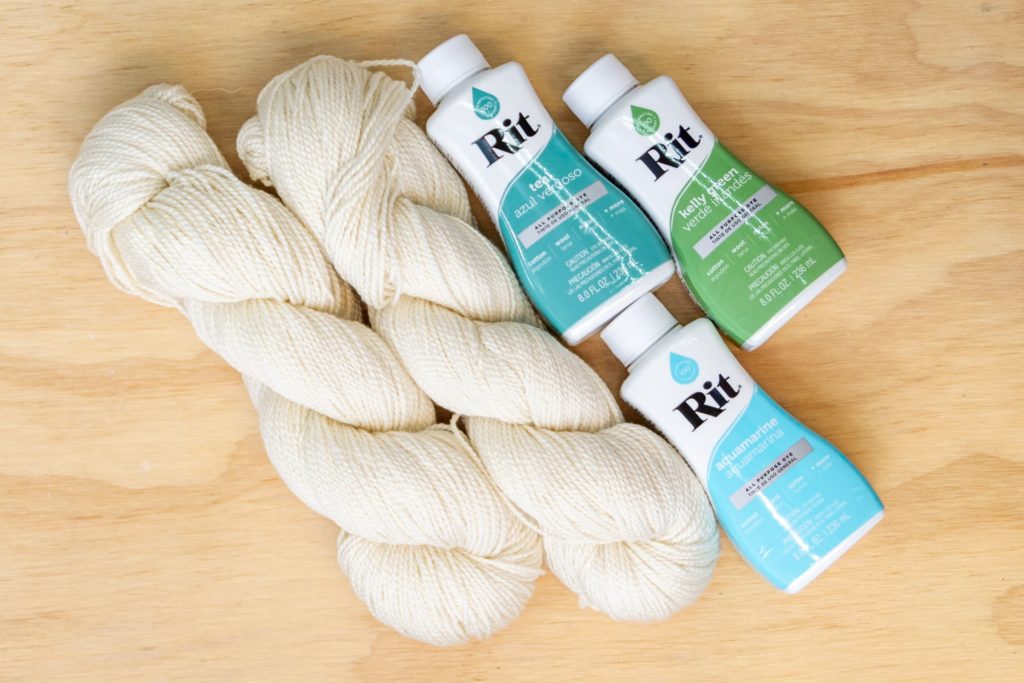 RIT Dye is an easily accessible dye that is a lot of fun to work with. You can find RIT at your local craft store and it comes in a variety of colors and premixed into liquids! Today on the blog we are going to be transforming two skeins of PRISM 85% Fine Superwash Merino Wool, 15% Mulberry Silk into a dreamy seascape using three colors of RIT dye. In this blog, we are using the premixed liquid RIT dyes and we will only be using a tablespoon of each, so there will be plenty left over to dye more skeins of yarn!