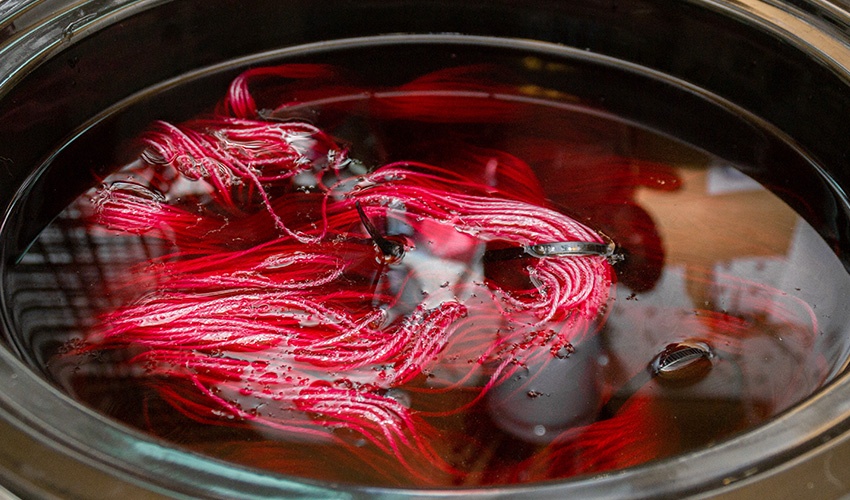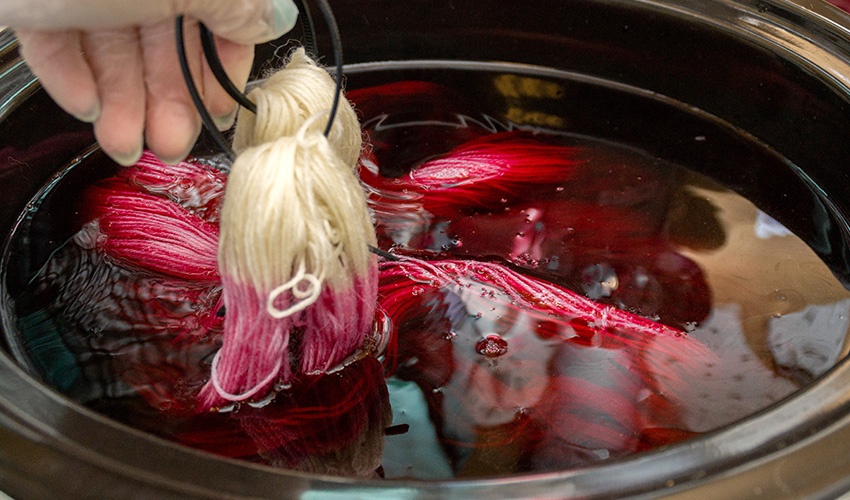 While the yarn is presoaking, set up the dye bath. Fill the slow cooker, or your usual dye vessel, with water leaving about two – three inches of room at the top. Put on gloves and a respirator. Dissolve 1 ½ teaspoons FLAMINGO PINK, 1 teaspoon BERRY CRUSH, and ½ teaspoon PEACH BLUSH into the dye bath.