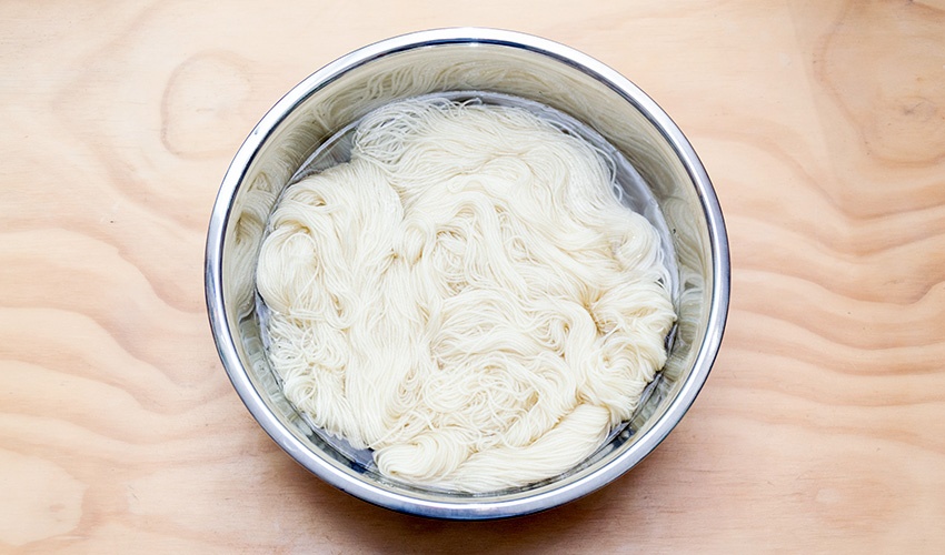 Fill a large bowl wil cool water leaving about two inches of room at the top. Loop zip ties through the skeins if you are using them. Submerge your two skeins of MAGNOLIA in the bowl fully. Allow the water to fully saturate the yarn. The yarn should change from a soft cream to a shade darker. Presoaking usually takes about an hour.