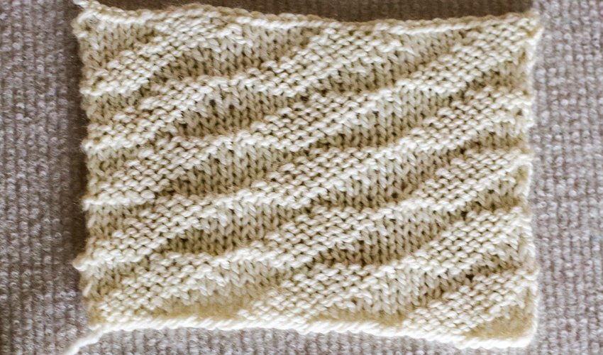 Slanted Diamond stitch is the perfect stitch to get that embossed-fabric or textured fabric look that takes advantage of this high-sheen final fabric. The combination of knits and purls doesn’t require fancy cables to show off, especially when knit at a slightly tighter gauge (as shown here on US 5 needles).