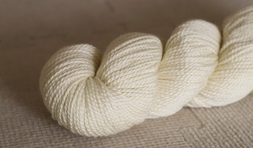 Oooh, do I love a good 2-ply! Prism is a newer yarn from Knomad, spun from 85% Superwash Merino Wool and 15% Mulberry Silk. The important distinction with Mulberry Silk here is how pure white that silk is–compared to say, Muga silk, which has golden undertones. Although the yarn is a bright, pure base, it does have a slightly warm undertone (important to keep in mind for dyeing).