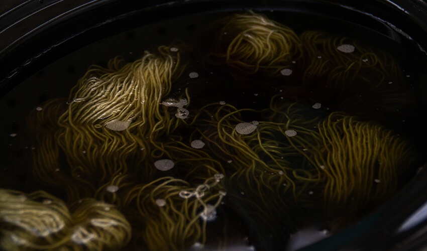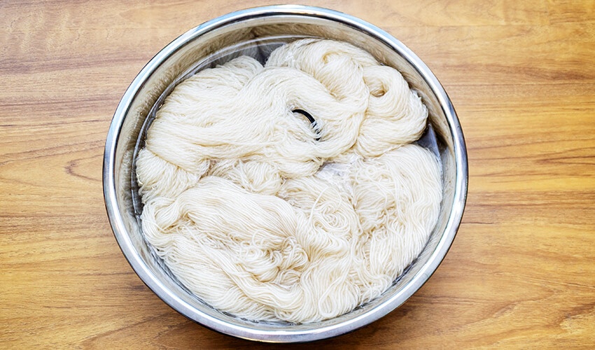 Remove the lid and allow the yarn to cool fully before rinsing it out in room temperature water. It usually takes 2-3 hours for the yarn to cool. When you rinse the yarn, the water should run clear. Squeeze the skein gently and rinse it a few times before hanging it to dry.