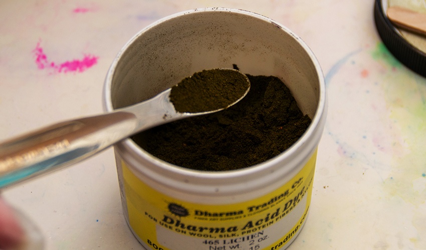 Fill your dye pot about two thirds of the way with room temperature water. While wearing your respirator and gloves, dissolve ⅛ teaspoon of Lichen dye into the dye bath. Dissolve a generous dash of citric acid into the dye bath (1-2 tablespoons). Stir to ensure both the acid and dye are fully dissolved. Now you’re ready to add your yarn!