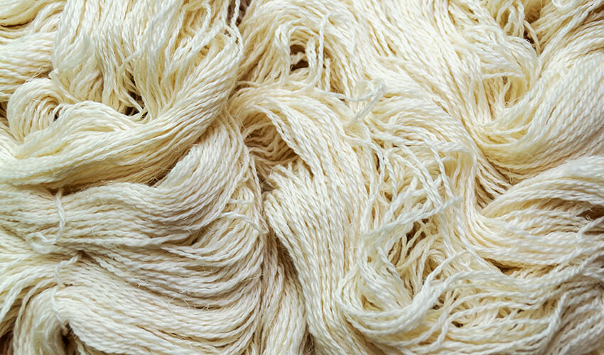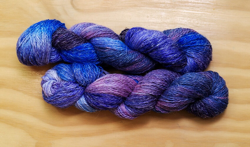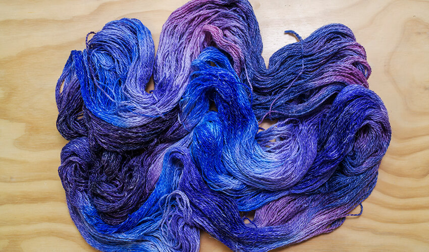 Space dyeing is a broad term meaning yarn that has multiple colors of dye applied to it – usually 2-4 colors. One of my favorite methods for space dyeing is by using jars to dip dye sections of yarn. This method creates a natural ombre effect as the ends that go into the jars first are the most saturated and the color is slowly absorbed up the strands of yarn. Today we are going to be using this method to transform BRISTLE yarn from the creamy undyed yarn to shades of purple and blue. BRISTLE is 70% fine organic merino wool and 30% hemp. The hemp gives the yarn a crisp body making it a great yarn for a project that needs a little more structure. Hemp is a cellulose fibre and will not absorb acid dyes in the same way so you will have some light strands twisting throughout the yarn for a beautiful, multidimensional effect.