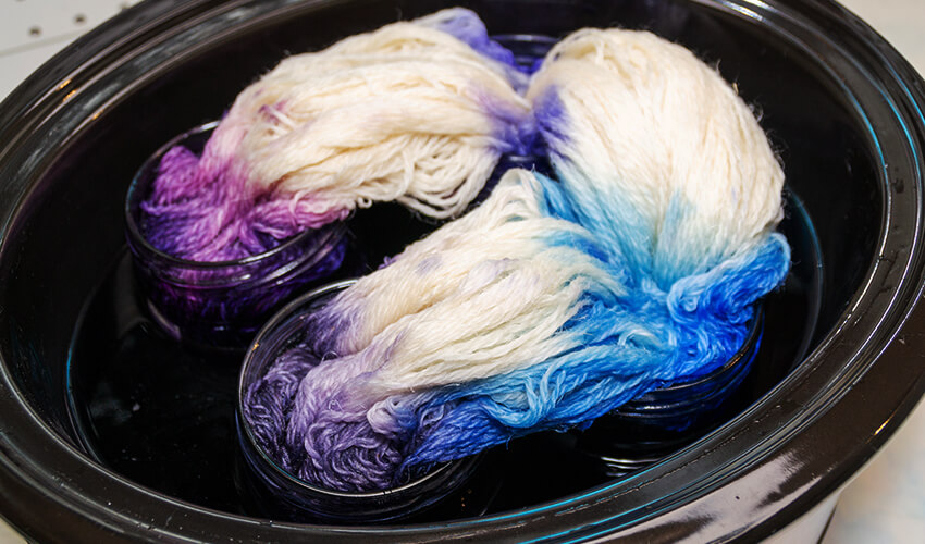 There is a variation on this technique that might be interesting to try! The same method can be used with food coloring and then instead of putting the jars in a slow cooker, you can put them in your microwave and do 15-30 second bursts with a 45 second break in between until you’ve microwaved the yarn for a total of four minutes. This is only advisable for food safe dyes as putting acid dyes in your microwave would make it no longer food safe.