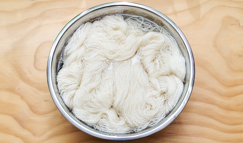 Fill a large bowl with cool water and dissolve two tablespoons of citric acid into it. If you are using shower rings or zip ties, loop one through each of your skeins now to keep them from tangling. This is optional and makes it easier to maneuver the skeins. Submerge the two skeins of BRISTLE undyed yarn into the bowl and allow the yarn to absorb the water fully. A thorough presoak is essential for an even dye application because it opens up the outer cuticle layer of the fibre allowing the dye to penetrate evenly. It usually takes about an hour for the yarn to fully saturate.