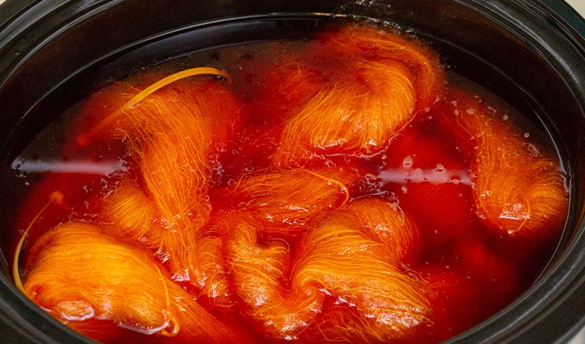 Once the yarn is hot, pour the Monarch Orange dye solution into the dye pot. Use tongs to manipulate the yarn, ensuring the dye flows freely around the pot. Replace the lid and allow the yarn to set for fifteen minutes.