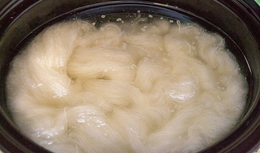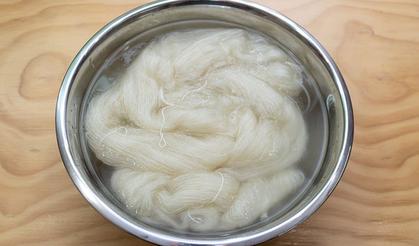 This process usually takes an hour. A thorough presoak helps create an even dye application. Protein fibres like mohair have a protective outer cuticle later that will swell and open during the presoak process.