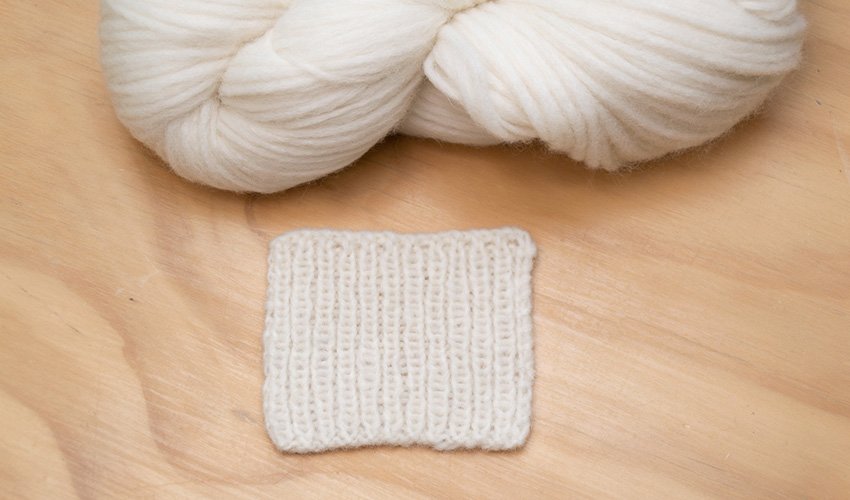 This Chunky Rib Beanie is another quick and cozy project. Rib knit is a stitch that adds volume to your knits, which pairs perfectly with the airy blend of alpaca, wool, and nylon in our Meringue yarn. We have knit up a swatch in a basic 1×1 rib knit stitch to show off this volume and structure.
