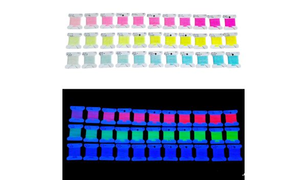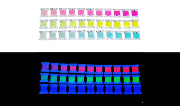 For those of you that like making colorways meant to be viewed under blacklight, here’s our color study comparison under a UV bulb.