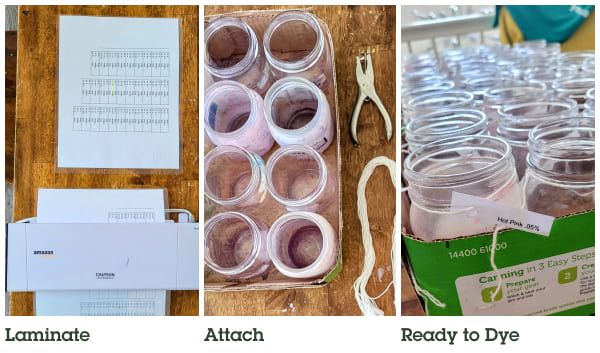 While the minis are soaking, laminate a page with the following dye concentrations on it, hole punch and attach to your dye jar. This is how we will be keeping track of our percentages.