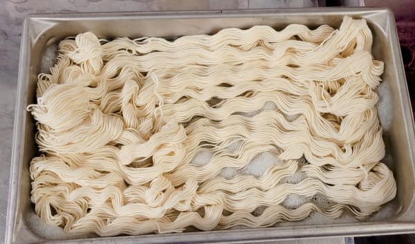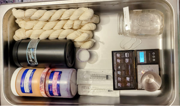 Rinse your yarn out one skein at a time, and make sure to tie each jar tag onto the skein so we can keep our percentages straight.