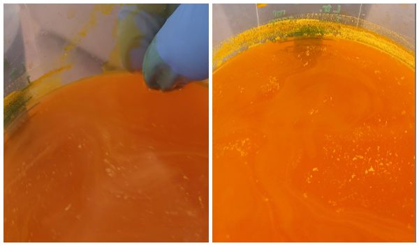 I used my fingers and hot water to rub the dye particles that stuck to the edge of the measuring cup so that the dye stock could be measured as accurately as possible.