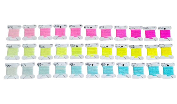Abstract: There’s a new blacklight reactive blue on the market (a first) so we’re going to build a 66-color triad dye study from a fluorescent pink, yellow and blue. But to make sure that it’s “balanced”, we need to find the saturation point for each color that matches optically. Otherwise, the most saturated color will overtake our whole study and we won’t get to see the balanced interplay of possible hues.
