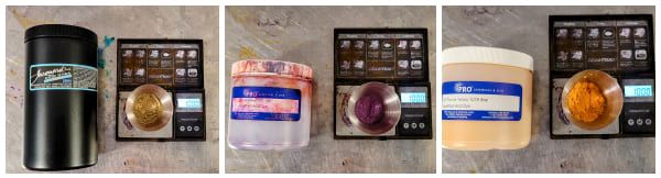 Now we’re ready to start adding dye stock to jars! Since 10 grams of dye is dissolved in 1000 ml of water, we can measure the tiny fractions of a gram far more accurately (and quickly) with syringes rather than dye powder, which is so small most gram scales won’t be accurate enough.