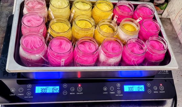 Now we’re ready to add the skeins into the dye jars. I like to dunk each one a few times so there’s no “crinkled” spots on the skein that resist the dye and end up white.