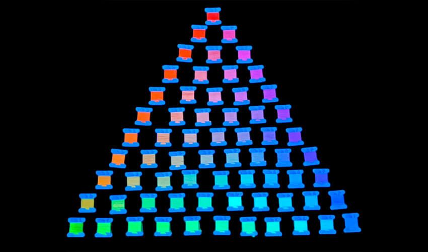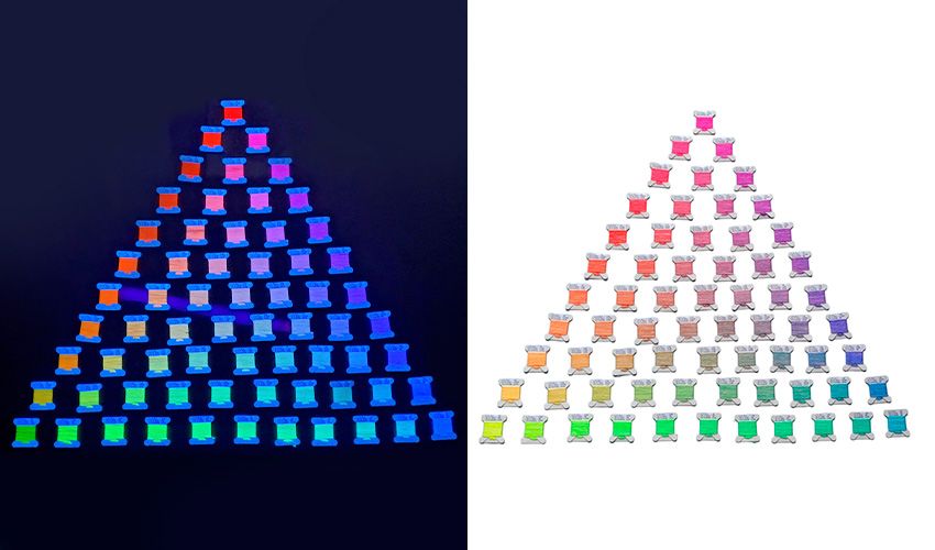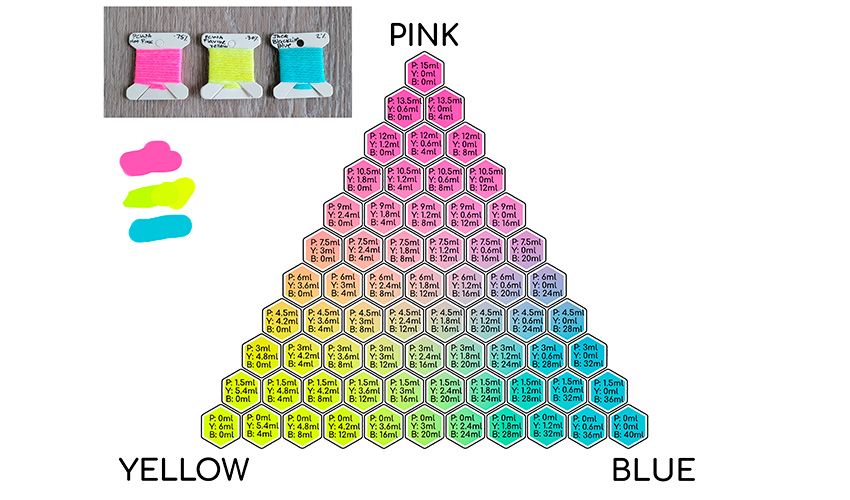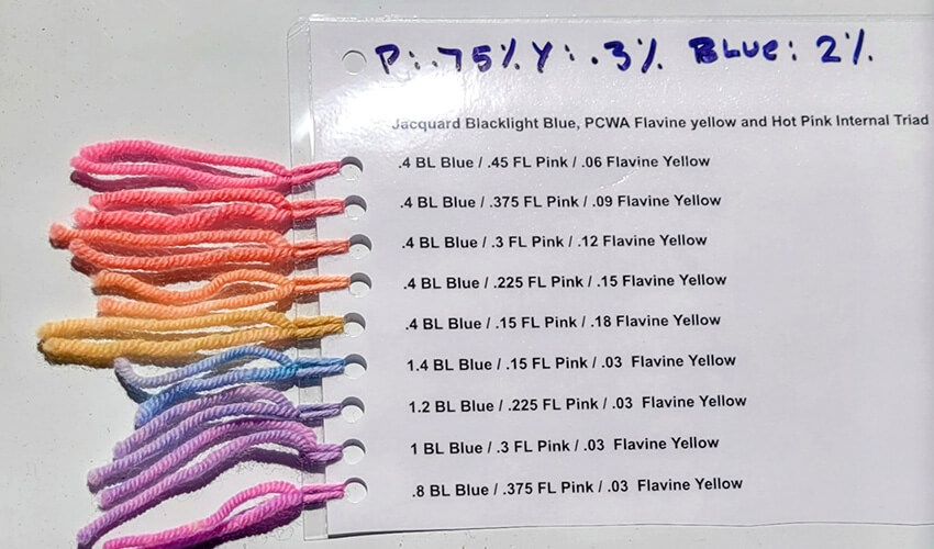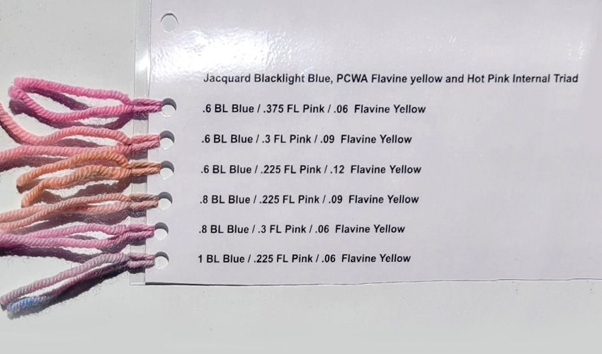 Abstract: There’s a new blacklight reactive blue on the market (a first) so we’re going to build a 66-color triad dye study from a fluorescent pink, yellow and blue. In part 1, we balanced each color to the same optical strength so no one color overtakes another. In part 2, we’re taking that formula and calculating 66 different values. The external legs of the triad are between 2 colors, the internal triangle is a mix of all 3. This blog post is not a theory of how to build a triad, but a recipe for you to follow along with at home to create this particular color study. Triad dyeing is very complicated math that is outside the scope of what a blog post can cover. If you want to know more about how the math is calculated, please see my YouTube video from 4 years ago on triad dyeing.