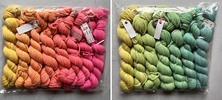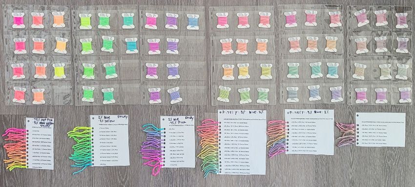 I wound each color on a floss bobbin, printed/taped out the recipe on the top, then mounted them in a coin-collectors pouch. I also laminated an “at a glance” chart where I crocheted the yarn to a laminated page with the recipe so I can see all 66 colors right next to each other when colorway planning.