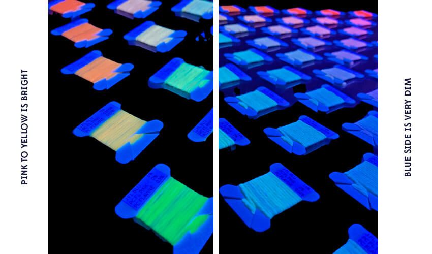 Notice how the pink and yellow clearly fluoresce pink and yellow, and that the increasing saturation point shows under blacklight? Notice how the “blue” remains consistent regardless of how much dye powder was used and fluoresces very little compared to the other two colors? My personal opinion is that this is not a truly blue fluorescent dye pigment, but a small amount of blue dye put into an optical brightening powder of some sort. To the naked eye, while photographing this, it doesn’t even glow blue, but white.