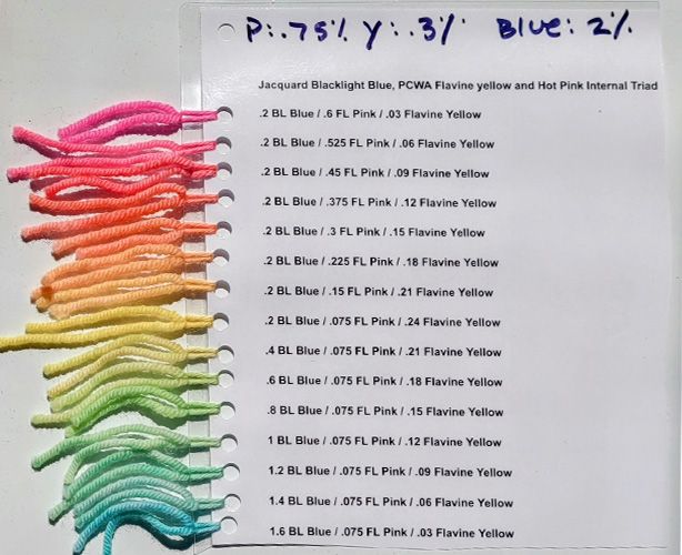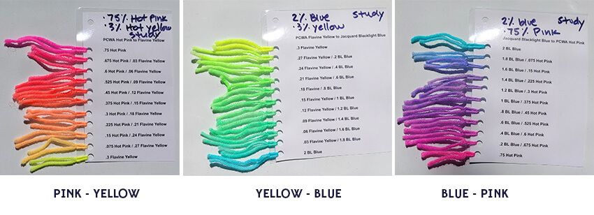 I hope you enjoyed seeing all the beautiful colors we can create from these 3 fluorescent primaries, and that you picked up a good organizational system to store your new dye recipes.