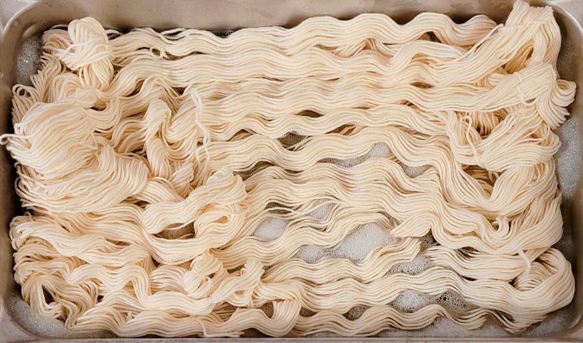 Fill an 8” deep tray with 2 gallons of warm water and 1 tsp of Synthrapol. Carefully untwist the minis and lay them across in a straight line so they can be easily picked out without tangling. Let the minis soak overnight so they’re thoroughly wet.
