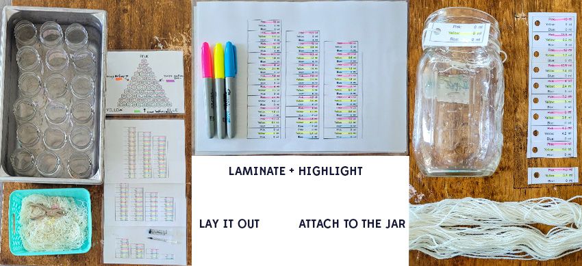 While the minis are soaking, laminate a page with the following dye concentrations on it, hole punch and attach to your dye jar. This is how we will be keeping track of our percentages. I highly recommend highlighting the amount of each color with the corresponding sharpie highlighter to help keep each formula easily readable while measuring out 198 precise amounts.
