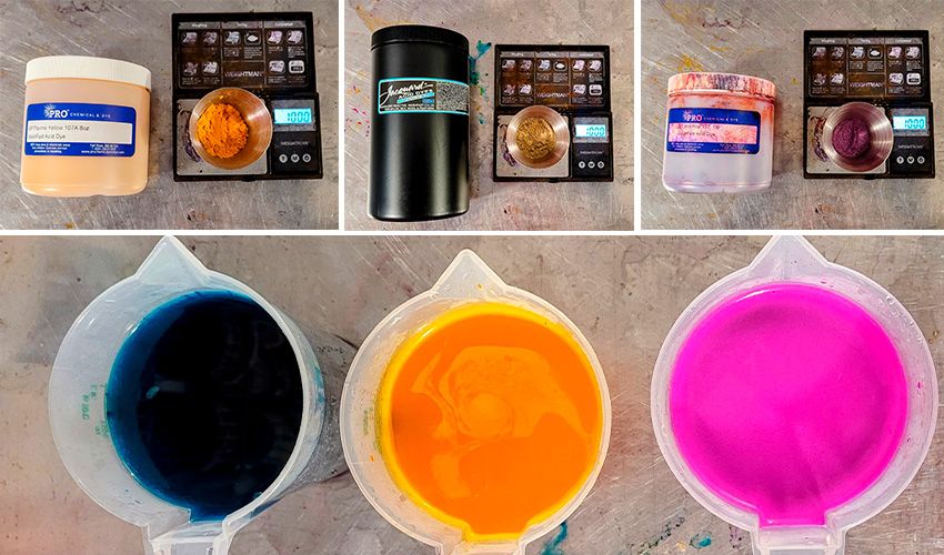 You can copy and paste these values into an excel document or just print this triad picture, laminate, hole punch and attach to the jar. We’re using the Hot Pink at .75% dos, Flavine Yellow at .30% dos and Blacklight Blue at 2% dos. It would be way easier to calculate everything at 1%, but the triad would be very yellow-focused and out of balance due to the potent strength of the yellow.