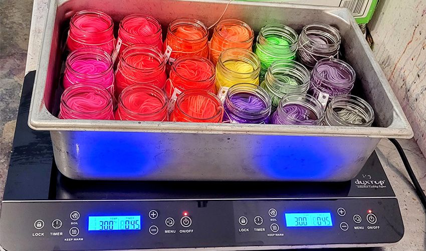 My 8” deep tray can hold 18 pint jars, so I did batches of 18. I started with the external triad legs, which are between 2 colors, and did all the pink values first, then the yellow, then the blue. Make sure to rinse your syringes very well between color changes. I fill the tray with hot water to about an inch from the top of the jar and let sit on the induction burner for 45 minutes at 300 degrees Fahrenheit. Let cool to room temperature, rinse each skein individually, and attach the laminated recipe to each skein as you go.