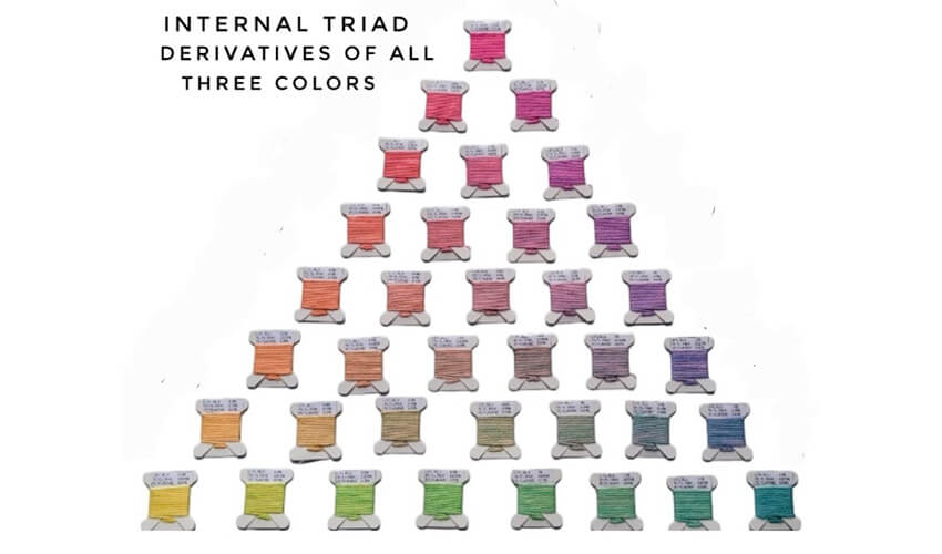 Here’s our external triad legs, which is 9 different oranges between the pink and yellow, 9 different greens between the yellow and blue, and 9 different purples between the pink and blue.